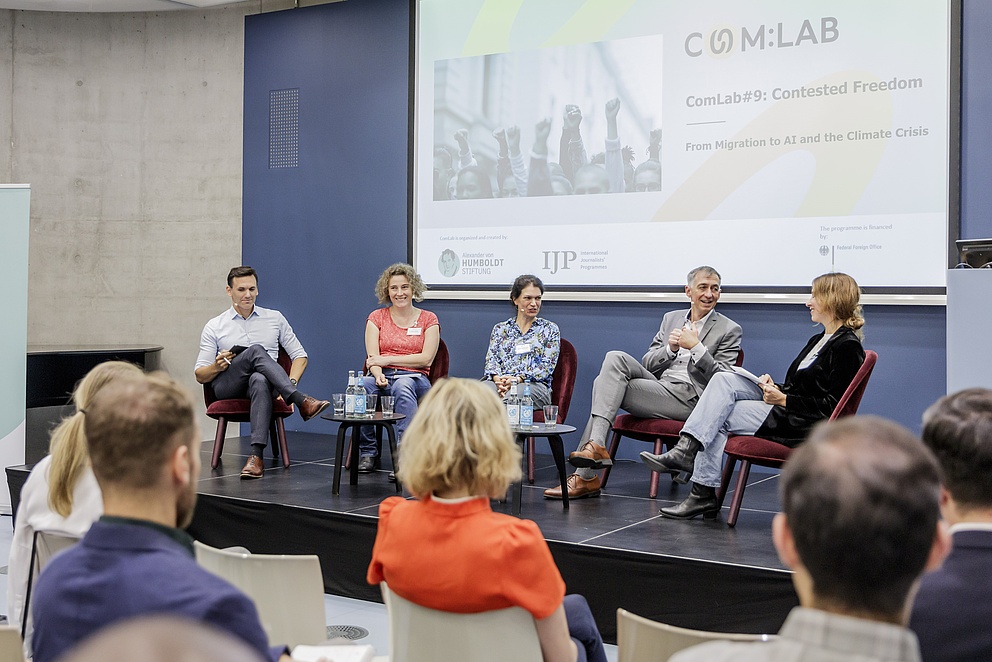 Wie lassen sich individuelle Freiheiten und das Gemeinwohl heute noch zusammen denken? Am ersten ComLab-Tag diskutierten Ralf Beste (Abteilungsleiter für Kultur und Gesellschaft, Auswärtiges Amt), Celine Teney (Professorin für Makrosoziologie, Freie Universität Berlin), Yannis Theocharis (Professor für Digital Governance, Technische Universität München) und Ulrike Winkelmann (Chefredakteurin der taz) über die Kluft zwischen wissenschaftlichen Erkenntnissen und dem Erfolg populistischer Diskurse. Dabei ging es um folgende Leitfragen: Was können Forschung und die Medien tun, um falschen oder vereinfachenden Darstellungen zu den Themen Migration oder Klimakrise entgegenzuwirken? Welchen Einfluss haben die sozialen Medien auf die Gestaltung des öffentlichen Diskurses und die Förderung von Hassreden, Fake News und Radikalismus? Und: Haben Forschung und Berichterstattung eine besondere Verantwortung, um in Zeiten von zunehmendem Populismus und Desinformation ein demokratisches Bewusstsein zu schaffen?