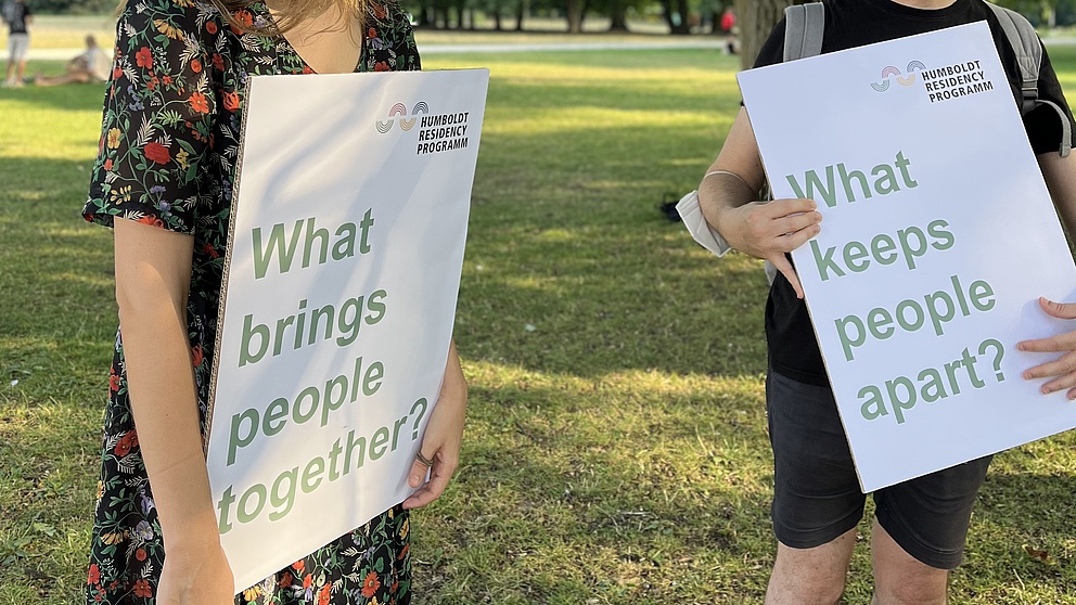 On Tuesday afternoon we all headed to Treptower Park to try out a new way of engaging the public on the issue of social cohesion. Armed with two signs reading ‘What brings people together?’ and ‘What keeps people apart?’, we approached unsuspecting Berliners enjoying the afternoon sunshine and asked them for their answers to the questions. Hardly anyone refused to engage with us and we received a lot of very interesting responses. Politics and religion were perhaps the most frequently given answers to the question ‘What keeps people apart?’ but other interesting responses included ‘miscommunication’ (from an Italian couple on holiday – at least, I think that’s what they said) and ‘fighting over girls’ (from a group of teenage boys playing football). The main factors thought to bring people together were love, culture in its various forms, and food and drink.