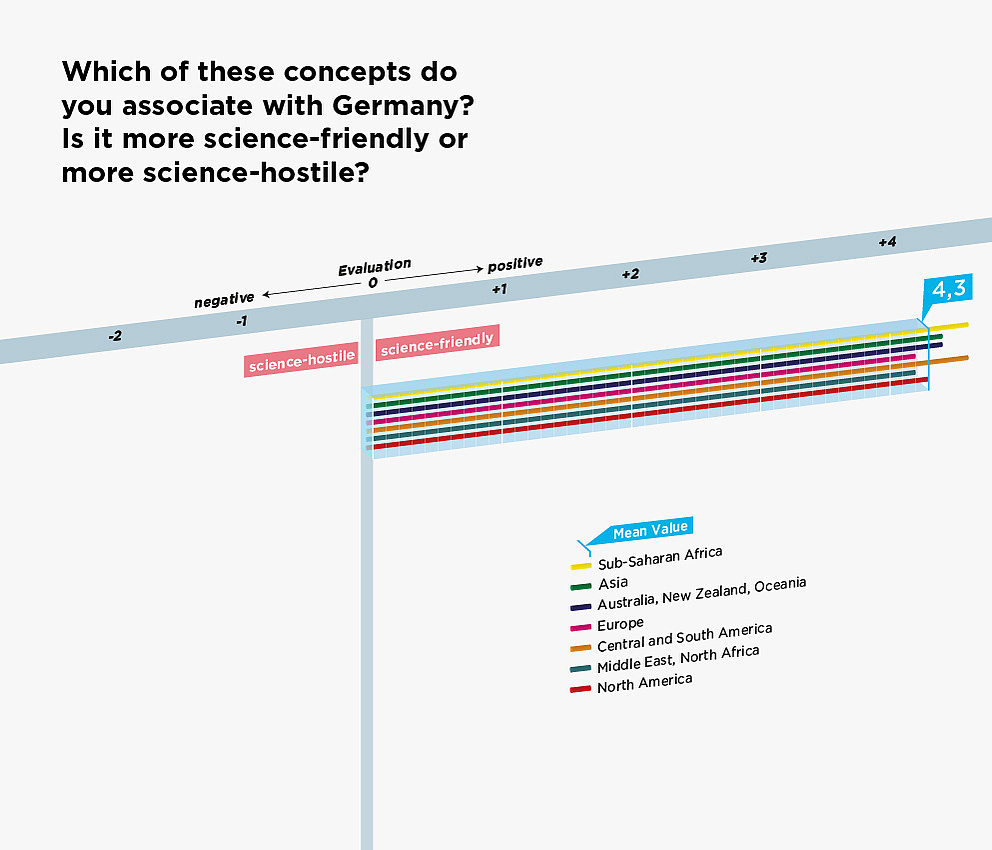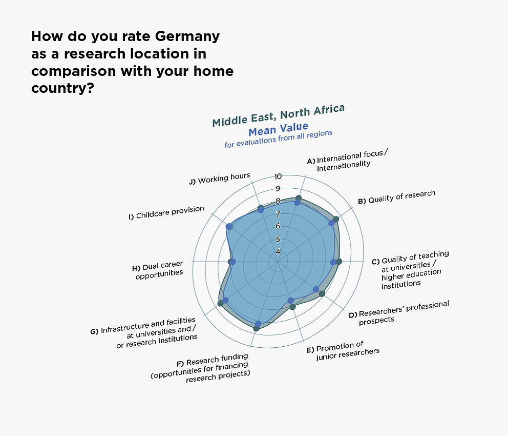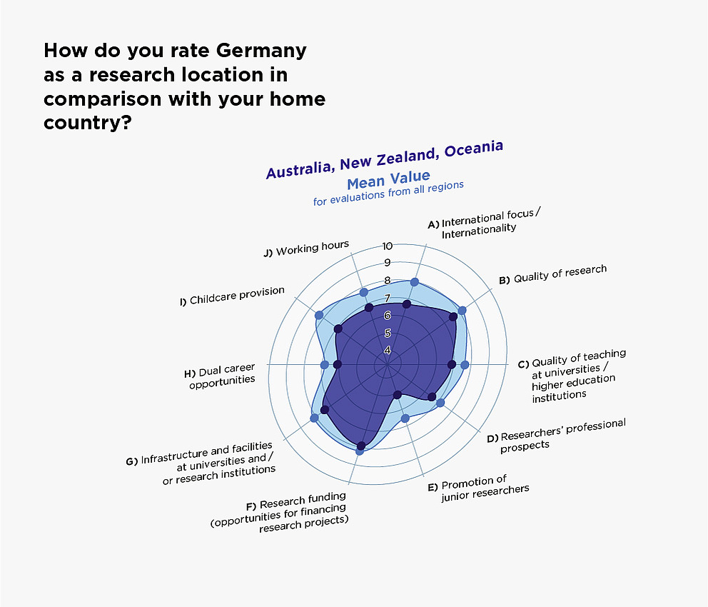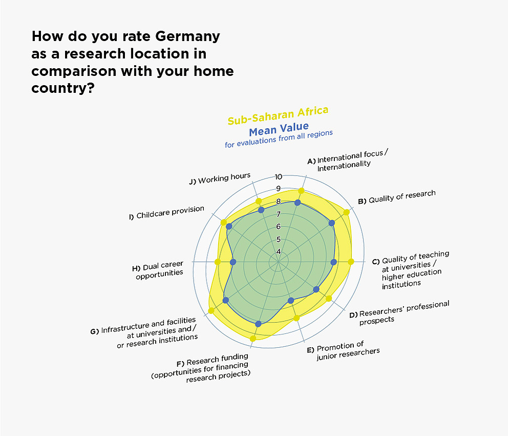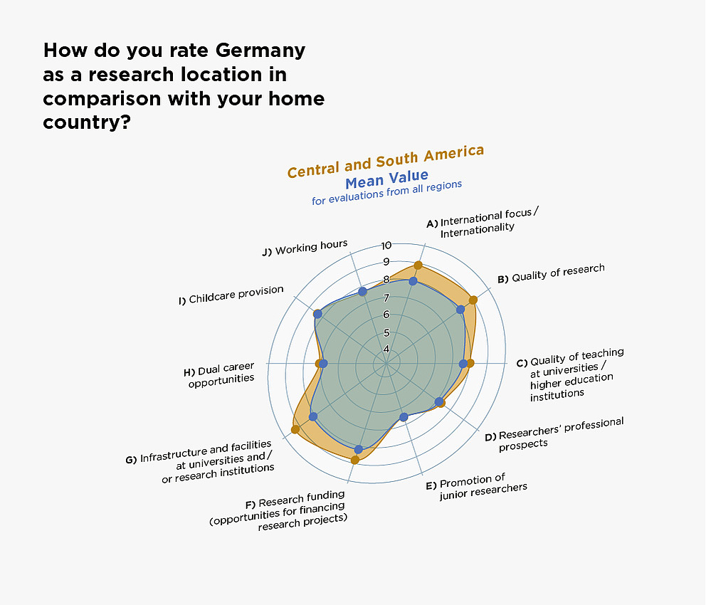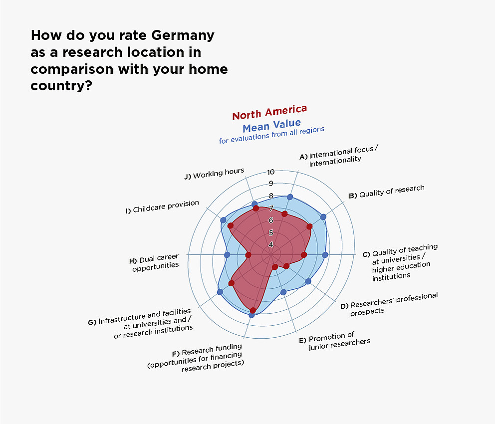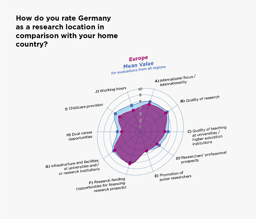 In comparison with other parts of the world, Germany is largely rated positively – with clear differences in some cases depending on whether the respondents come from Africa or North America, for instance. Despite these divergencies, everyone is agreed on the fields in which Germany is strong, such as infrastructure, and weak, such as dual career opportunities and promoting junior researchers.