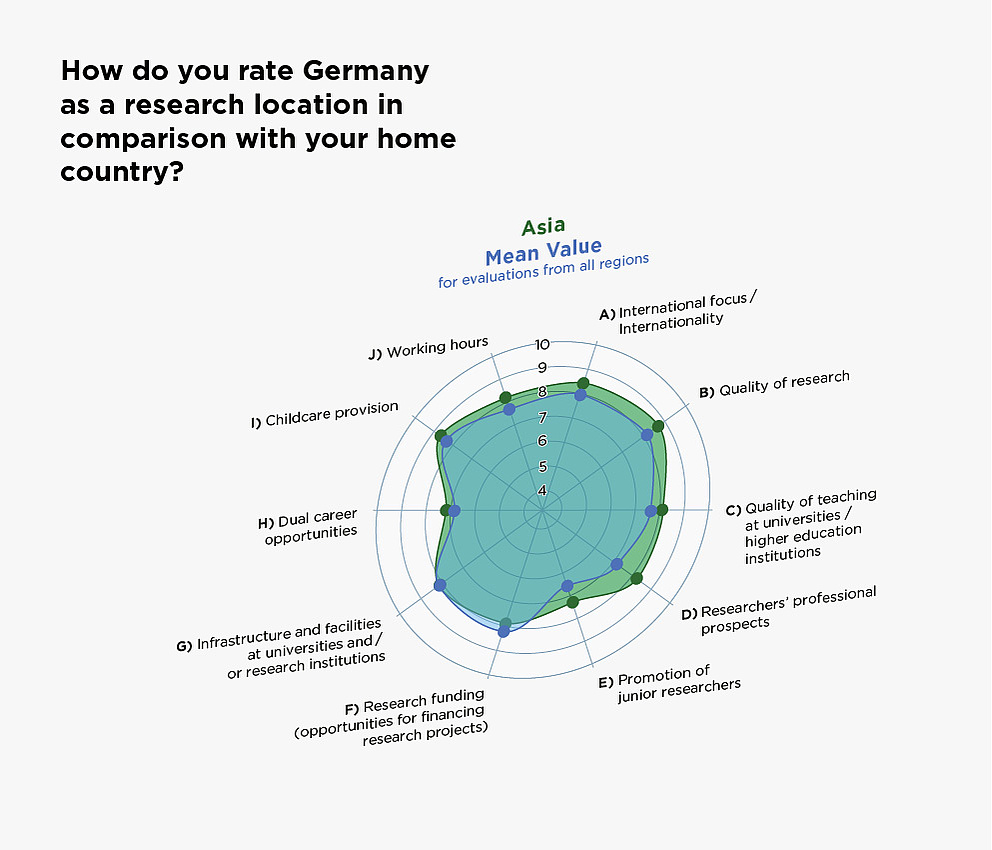 The answers to this question differ enormously depending on the country of comparison. Japanese and American researchers think working hours are better than at home. French and British researchers consider professional opportunities to be worse here whilst their Chinese and Italian colleagues think they are better. All in all, Germany largely performs favourably, although there is room for improvement in comparison with certain countries.