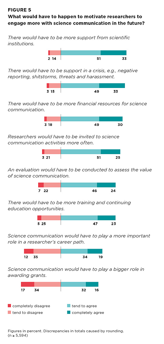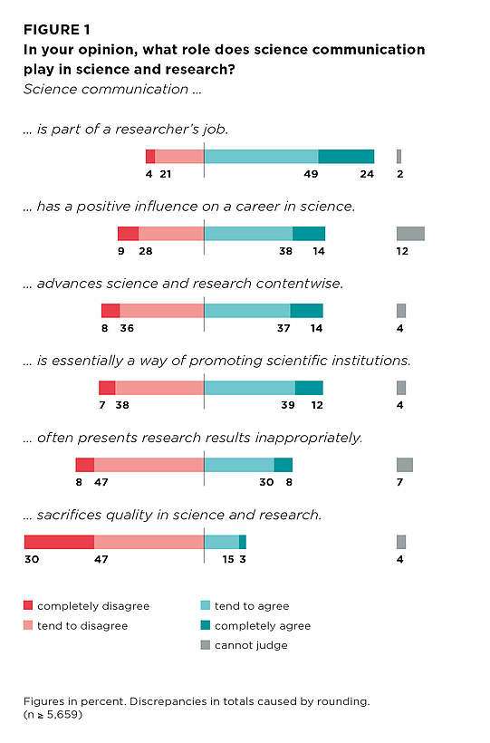 Source for all figures: Science communication in Germany: results of a survey of 5,688 researchers at German universities and non-university research institutions conducted by the Impact Unit of Wissenschaft im Dialog, the German Centre for Higher Education Research and Science Studies, and the National Institute for Science Communication.