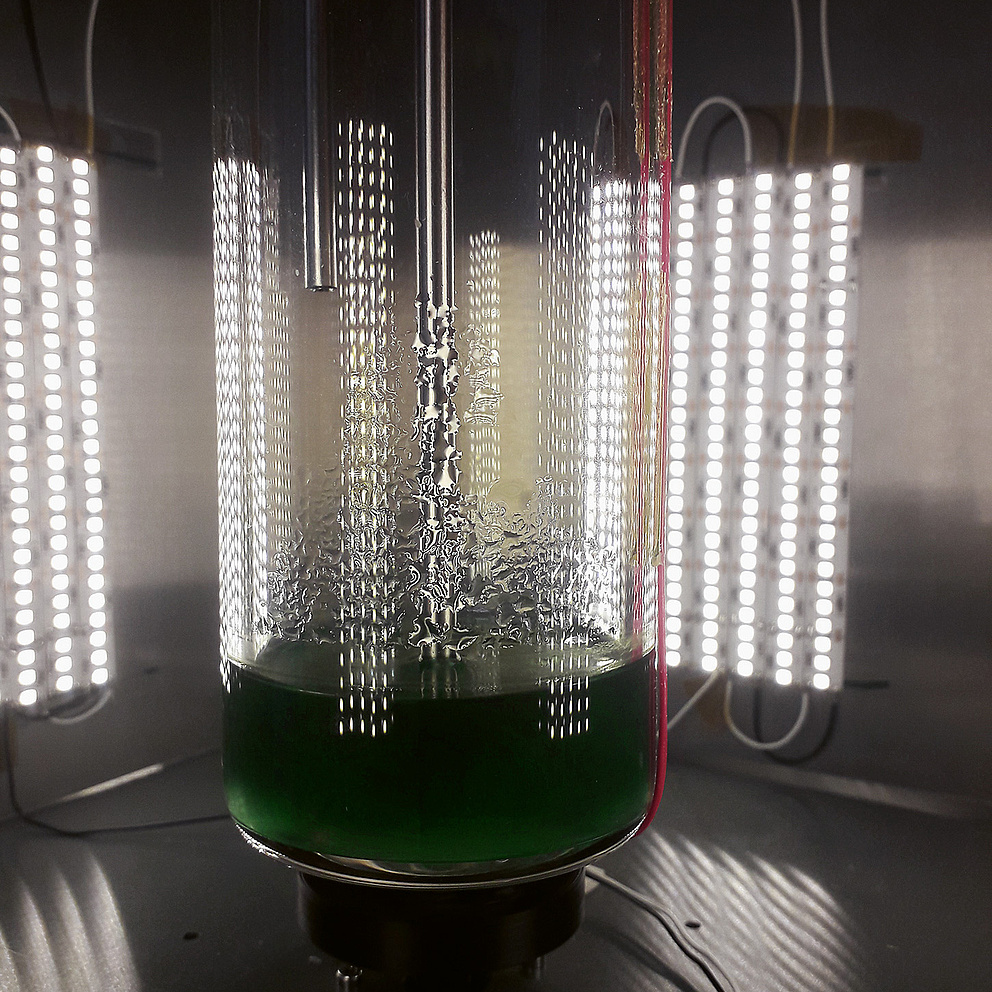 At first glance, Cyprien Verseux could be experimenting in the art of cookery. Atmos, short for Atmosphere Tester for Mars-bound Organic Systems, is the name of the metal cube on the lab bench. It is about a cubic metre in size and has nine glass vessels sticking out the top with tubes leading from their lids to gas bottles. If you look into the vessels that hold about a litre, you see a transparent, greenish liquid.