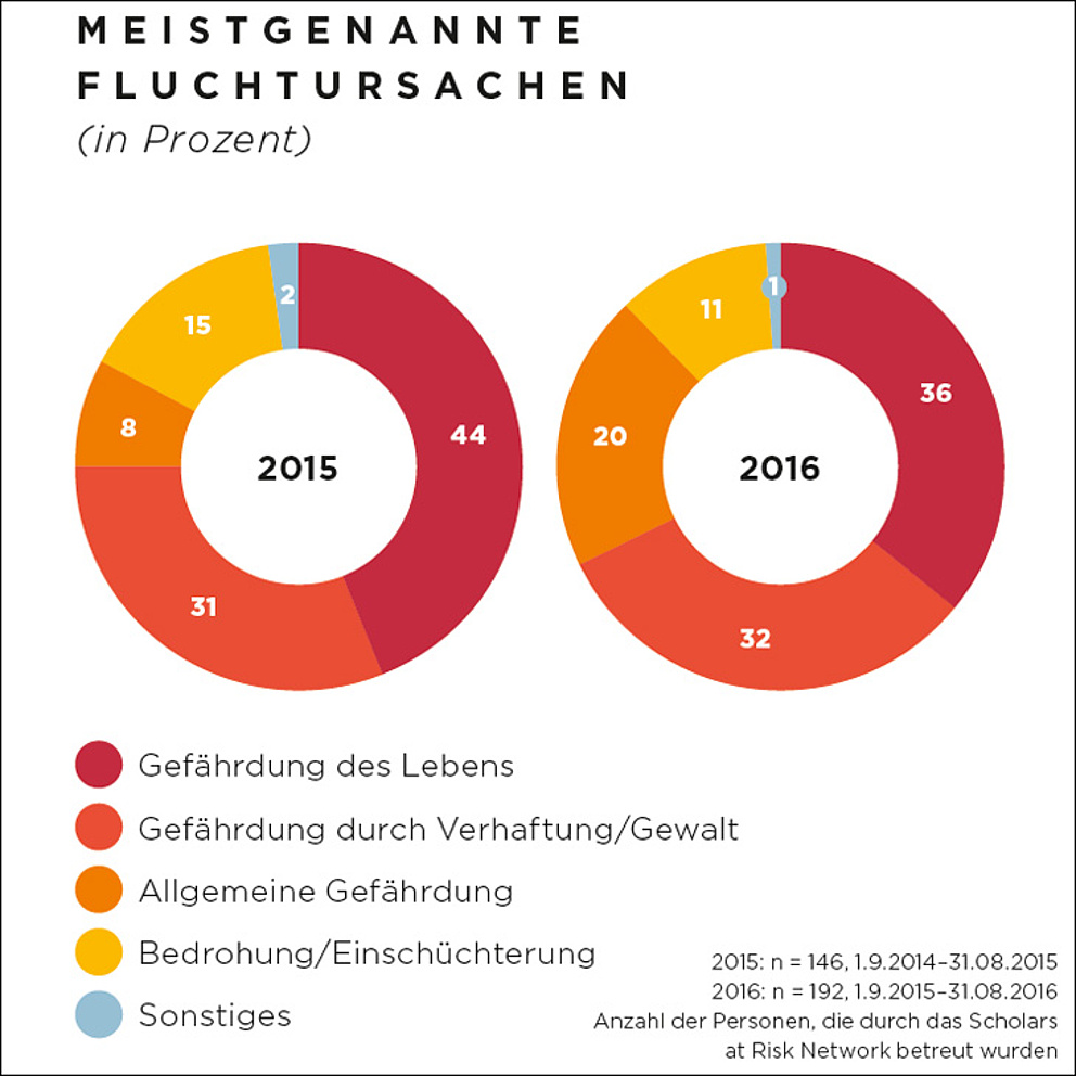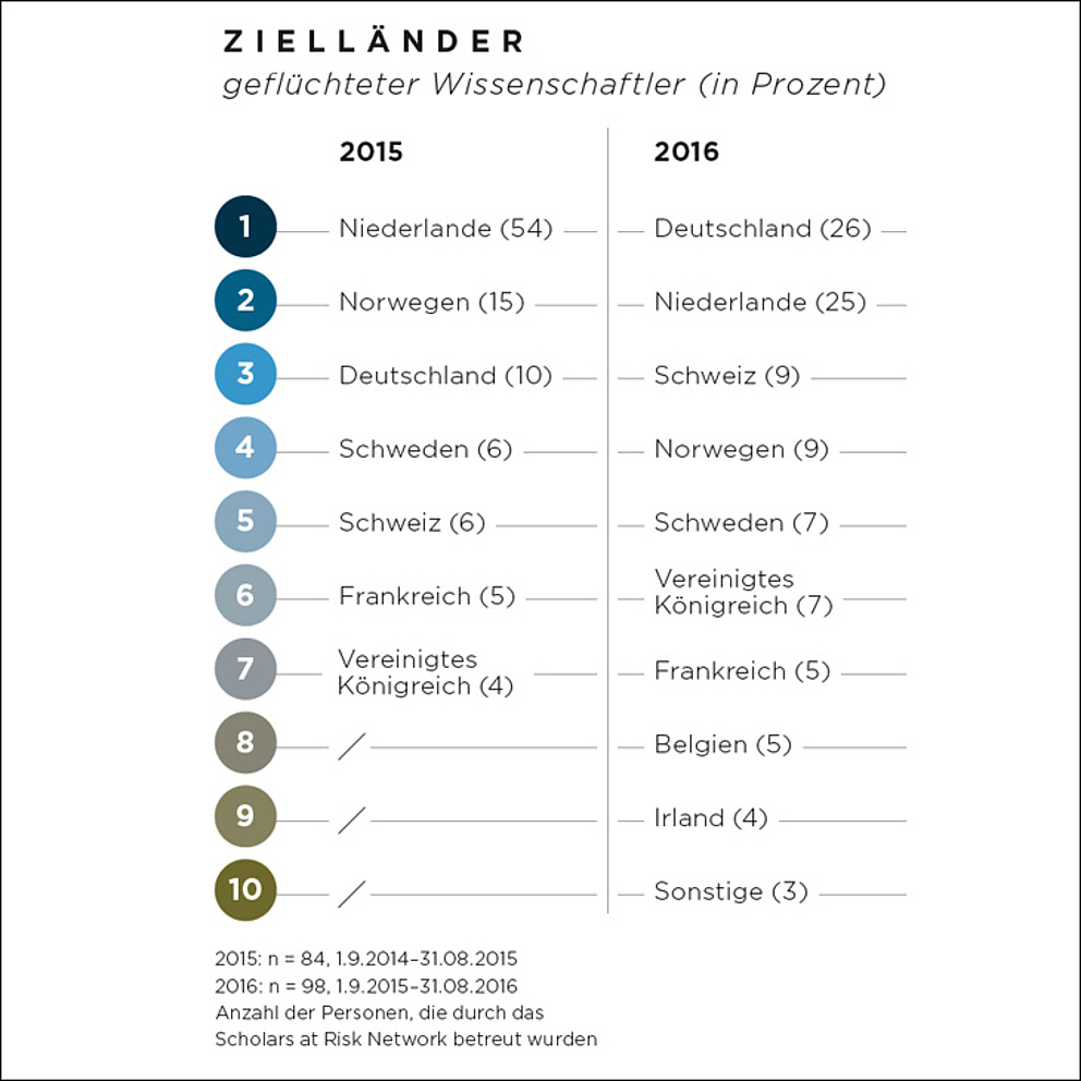 Es sind Geschichten von großer Gefahr und geglückter Rettung, die die Philipp Schwartz-Initiative erzählt. Die vorerst mehr als 60 Wissenschaftler, die damit gefördert werden, sind Teil des globalen, durch Krieg und Verfolgung ausgelösten Flüchtlingsstroms. Wie viele Wissenschaftler darunter sind, aus welchen Ländern und Disziplinen sie kommen und wo sie Zuflucht finden, ist nicht genau bekannt. Etwas Licht ins Dunkel bringen die Statistiken der größten Hilfsorganisation für bedrohte Forscher, des Scholars at Risk Network (SAR). In den weltweit mehr als 400 dazugehörenden Hochschulen und Forschungseinrichtungen fanden in den letzten zwei Jahren rund 340 Forscher Schutz. Dem SAR-Netzwerk gehören jetzt auch 20 Mitglieder einer neu gegründeten deutschen Sektion an, deren Geschäftsstelle die Alexander von Humboldt- Stiftung übernommen hat.