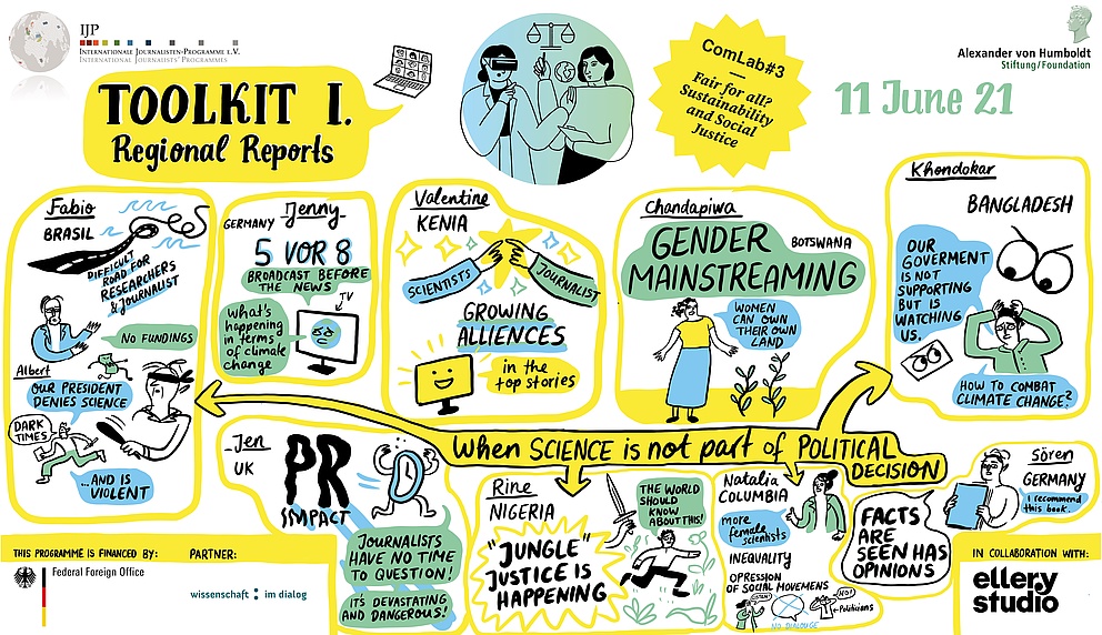 Am zweiten ComLab-Wochenende standen die Teilnehmer*innen und deren Erfahrungsschatz im Mittelpunkt: Zehn vielversprechende junge Wissenschaftler*innen und Geförderte der Humboldt-Stiftung und zehn Journalist*innen der Internationalen Journalisten-Programme tauschten sich zu Fragen der Nachhaltigkeit, aber auch zu medialen Formaten und internationalen Entwicklungen der Berichterstattung aus.
