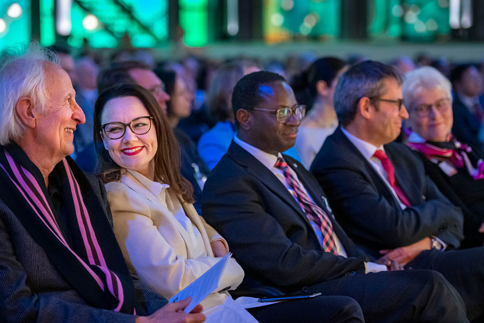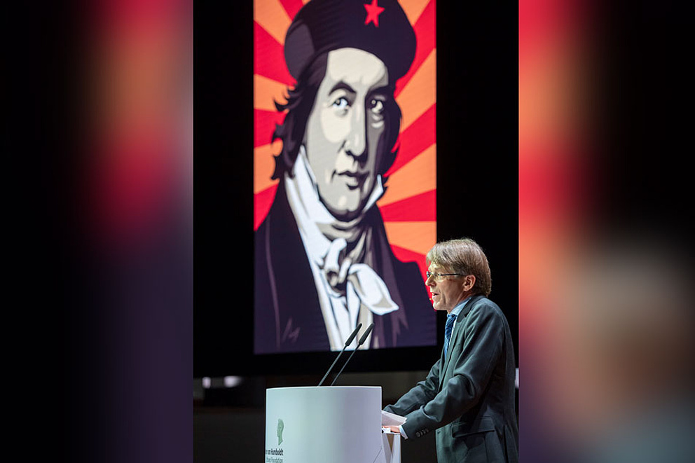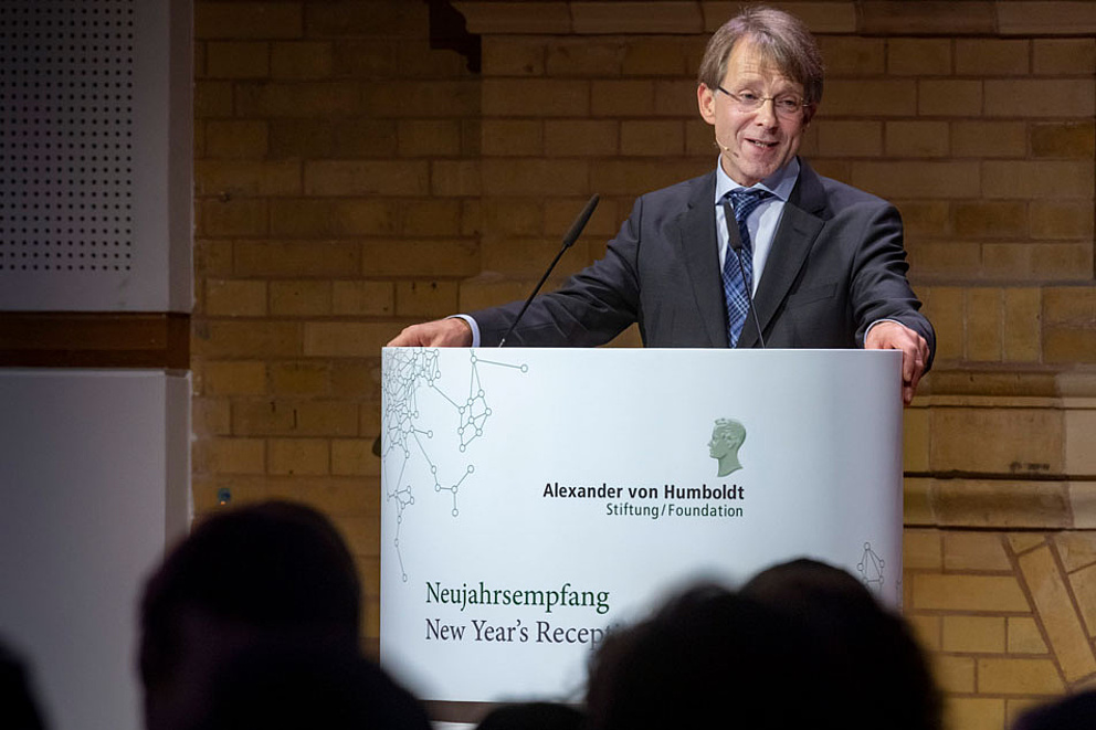 Stiftungspräsident Hans-Christian Pape begrüßte etwa 350 internationale Gäste aus Wissenschaft, Politik und Wirtschaft sowie Humboldtianerinnen und Humboldtianer, die zurzeit in Deutschland forschen. Er würdigte Humboldt in seiner Neujahrsansprache als Forscher, Humanisten und Kosmopoliten, der seiner Zeit voraus war, und deshalb auch heute noch populär und relevant ist. „Er warnte schon früh vor den Folgen von Umweltzerstörung. Er gilt als Begründer der modernen Klimawissenschaften“, so Pape. „Er machte Vorlesungen für ein breites Publikum, zu dem für ihn explizit auch Frauen gehörten – die zu dieser Zeit aus den preußischen Universitäten ansonsten noch ausgeschlossen waren. Er bezog Stellung, gegen Sklaverei, Kolonialismus und Ausbeutung.“