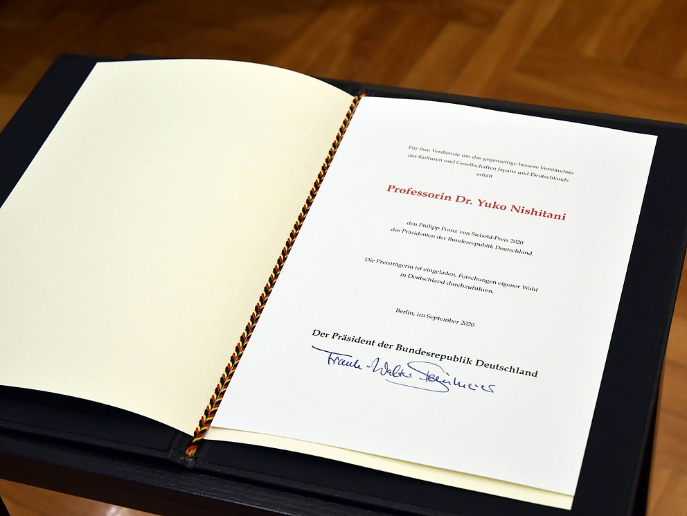 Der Philipp Franz von Siebold-Preis wird traditionell vom amtierenden deutschen Bundespräsidenten während der Jahrestagung der Humboldt-Stiftung in Berlin verliehen. Da die Jahrestagung dieses Jahr wegen der Corona-Pandemie digital stattfand, ist der Preis nun am 8. Oktober von der Deutschen Botschafterin in Japan Ina Lepel überreicht worden.