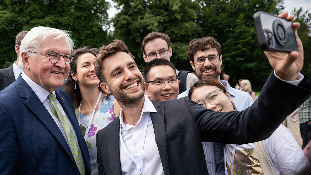 Bundespräsident Frank-Walter Steinmeier empfing die Humboldtianer*innen am 26. Juni im Park von Schloss Bellevue. In seiner Ansprache thematisierte er den Zusammenhang von Wahrheit, Vernunft und Demokratie. Um das Erbe der Aufklärung und um die Prinzipien politischer und wissenschaftlicher Freiheit stehe es vielerorts nicht zum Besten. Mit gravierenden Folgen: „Wo Universitäten und Forschungseinrichtungen gegängelt, wo willkürlich Projektmittel entzogen und Wissenschaftlerinnen und Wissenschaftler drangsaliert und aus dem Beruf gedrängt werden, da leiden auch der Rechtsstaat und die Demokratie“, so Bundespräsident Steinmeier. Gerade die Demokratie sei dringend darauf angewiesen, dass die Menschen vernünftig über Politik und gesellschaftliche Streitfragen diskutierten. „Wo die Wahrheit einen schweren Stand hat, geraten die Grundfesten freiheitlicher Ordnungen ins Wanken.“