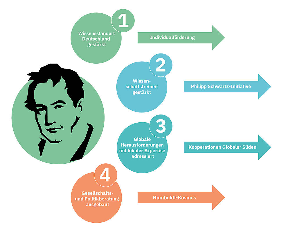 Die Alexander von Humboldt-Stiftung verfolgt die Vision eines weltumspannenden Netzwerks herausragender Forschender, die faktenorientierte Lösungsbeiträge entwickeln für eine Welt im Wandel. Die Stiftung fördert den Austausch internationaler Forschungspersönlichkeiten. Sie hebt das Wissen des Humboldt-Netzwerks und macht es nutzbar für Wissenschaft, Politik und Gesellschaft – für die Menschen in Deutschland, Europa und der Welt. Gerade in Zeiten globaler Krisen ist diese Mission wichtiger denn je. In den kommenden fünf Jahren nimmt die Stiftung vier Wirkungsziele in den Blick und richtet ihre Instrumente auf diese Wirkungsziele aus.