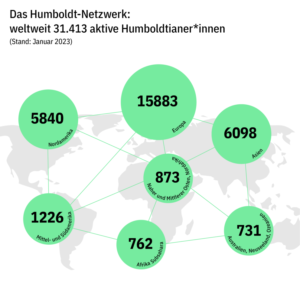 In 72 Ländern weltweit engagieren sich Forschungsstipendiat*innen und -preisträger*innen nach ihrer Rückkehr aus Deutschland in 109 Humboldt-Alumnivereinigungen, die als wichtige Knotenpunkte des Netzwerks dienen. Außerdem informieren 40 Vertrauenswissenschaftler*innen der Alexander von Humboldt-Stiftung im Ausland an Hochschulen und Forschungseinrichtungen über den Forschungsstandort Deutschland sowie insbesondere über die Förderprogramme und das internationale Netzwerk der Stiftung. Sie sind ehrenamtlich tätig und als Alumni, Gastgeber*innen oder Gutachter*innen für die Stiftung aktiv.