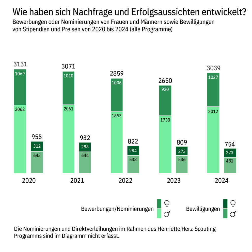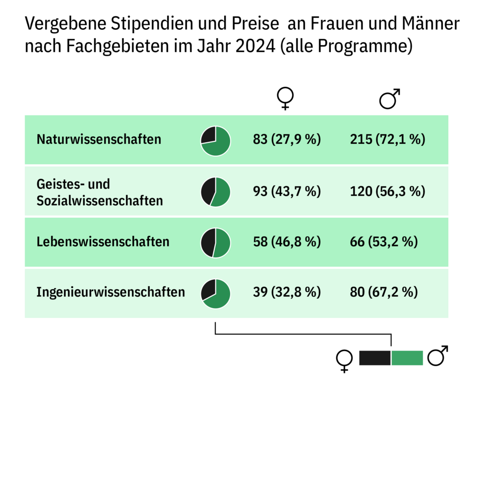 - entschiedene Bewerbungen/Nominierungen und Bewilligungen nach Ländern und Fachgebieten für die Stipendien- und Preisprogramme in den letzten fünf Jahren,